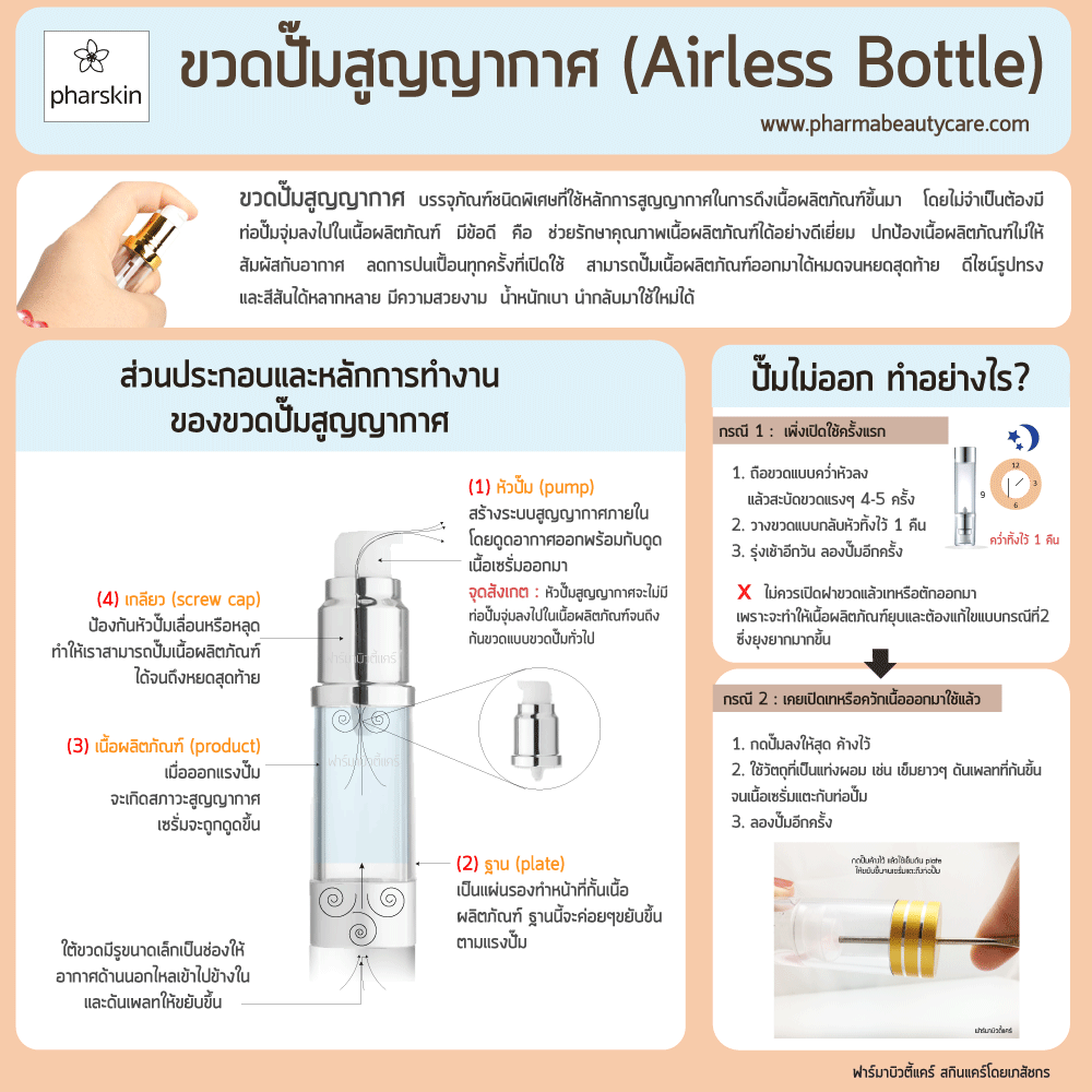 หลักการทำงาน : เมื่อเราออกแรงปั๊ม จะเกิดภาวะสูญญากาศภายใน เนื้อเซรั่มถูกดูดขึ้นมา เพลทด้านล่างจะค่อยๆขยับขึ้น เราจึงเห็นช่องว่างด้านล่างสูงขึ้นเรื่อยๆจนกระทั่งชนกับคอปั๊ม ซึ่งหมายถึงเนื้อเซรั่มหมด ไม่มีเหลือให้ปั๊มอีกแล้ว