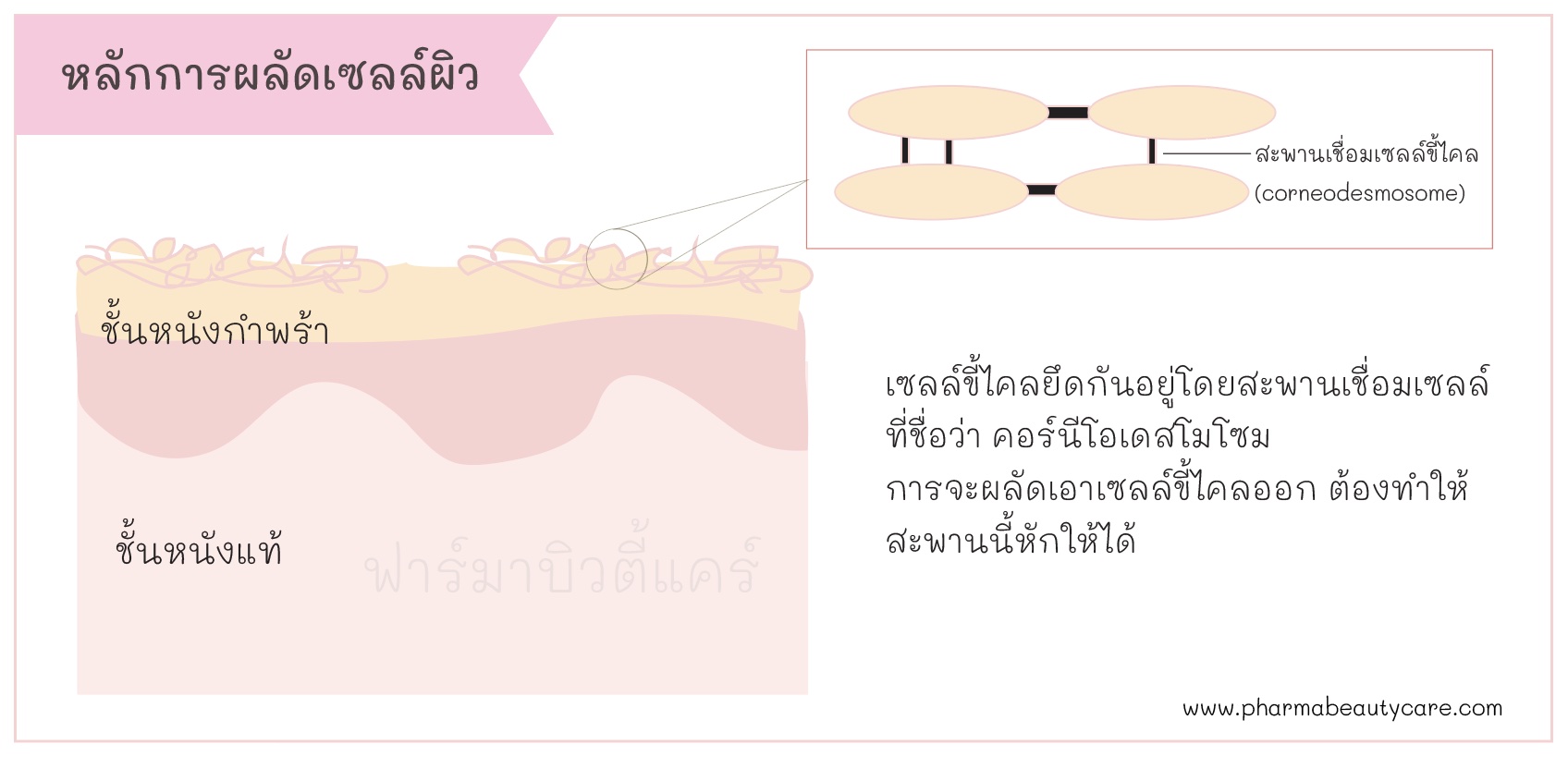 เซลล์ขี้ไคลแต่ละเซลล์ยึดกันอยู่ด้วยสะพานเชื่อมเซลล์ที่ชื่อว่า คอร์นีโอเดสโมโซม (corneodesmosome) เมื่อเซลล์หมดอายุ เอนไซม์ตามธรรมชาติบนผิว จะมาทำลายสะพานนี้โดยอัตโนมัติและหลุดออกเป็นขี้ไคล เซลล์เกิดใหม่จากด้านล่างซึ่งมีความอวบอิ่มกว่า สวยงามกว่า ชุ่มชื้นกว่า ก็จะเลื่อนมาแทนที่ ดังนั้น หากวงจรการผลัดเซลล์ผิวตามธรรมชาติของเรามีประสิทธิภาพ ตรงเวลา ผิวเราก็จะสวยงามอยู่เสมอ