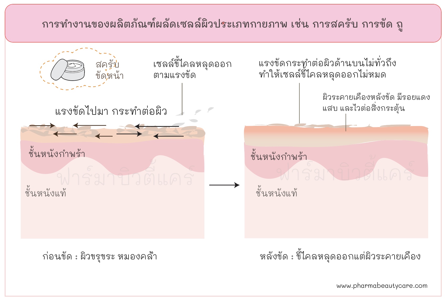 หลักการผลัดเซลล์แบบกายภาพ ใช้แรงทางกายภาพในการเอาชนะการยึดเกาะของเซลล์ขี้ไคล