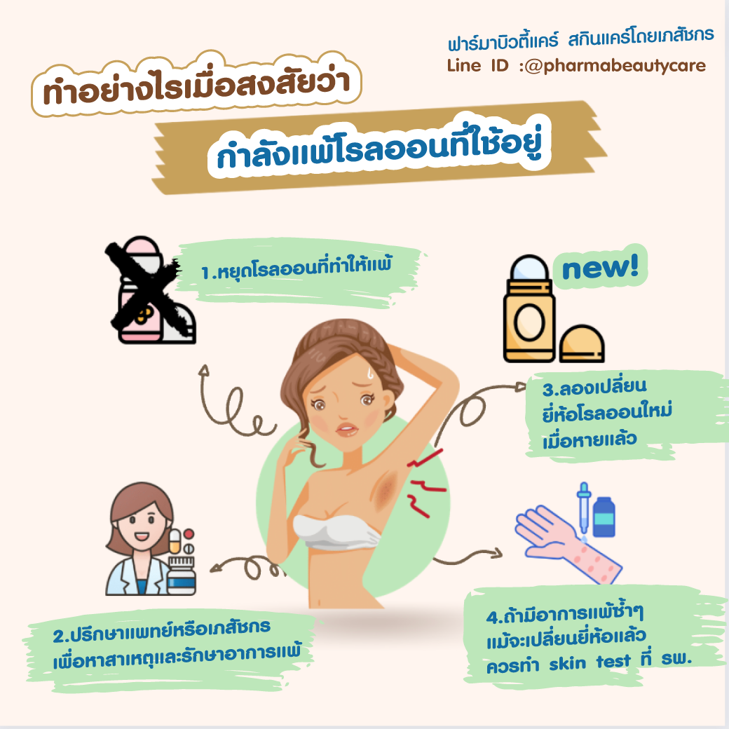 อันดับที่สอง ซื้อยาทาจากร้านขายยา แจ้งเภสัชกรประจำร้าน เล่าอาการให้ฟัง ส่งรูปถ่ายรักแร้ให้เภสัชกรดู เภสัชจะจัดยาแก้แพ้ แก้คัน ให้มาทา+ทาน ประมาณ 7-15 วัน สั้น-นาน ขึ้นกับอาการ เมื่ออาการดีขึ้นแล้วหรือใช้ยาครบแล้ว ให้หยุดยาจากนั้นลองทาโรลออน/ครีมรักแร้ยี่ห้ออื่นที่ไม่ใช่ยี่ห้อเดิม แล้วสังเกตดูว่า อาการแพ้กลับมาหรือไม่ ถ้าไม่กลับมาคือ โอเค ใช้ต่อได้