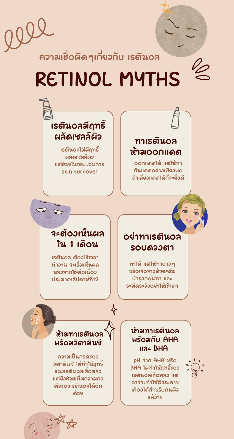 เรตินอล เป็นแอคทีฟเครื่องสำอางที่มีความมหัศจรรย์ ทั้งทางด้านการลดริ้วรอย ลดจุดด่างดำ ลดการอุดตัน ช่วยให้หน้าใสขึ้น แต่หลายๆคนยังมีความกังวลที่จะใช้ผลิตภัณฑ์ที่มีส่วนผสมของเรตินอล เนื่องจากมีความเข้าใจผิดเกี่ยวกับเรตินอลอยู่ค่อนข้างมาก เช่น เรตินอลมีฤทธิ์ลอกผิว ใช้เรตินอลแล้วโดนแดดไม่ได้ แน่นอนว่า เรตินอล อาจไม่ได้เหมาะกับทุกคนในโลกนี้ แต่ก็ไม่ควรด่วนสรุปว่า เราไม่เหมาะกับเรตินอล ถ้าเรายังไม่เคยลองใช้มันอย่างถูกวิธี
