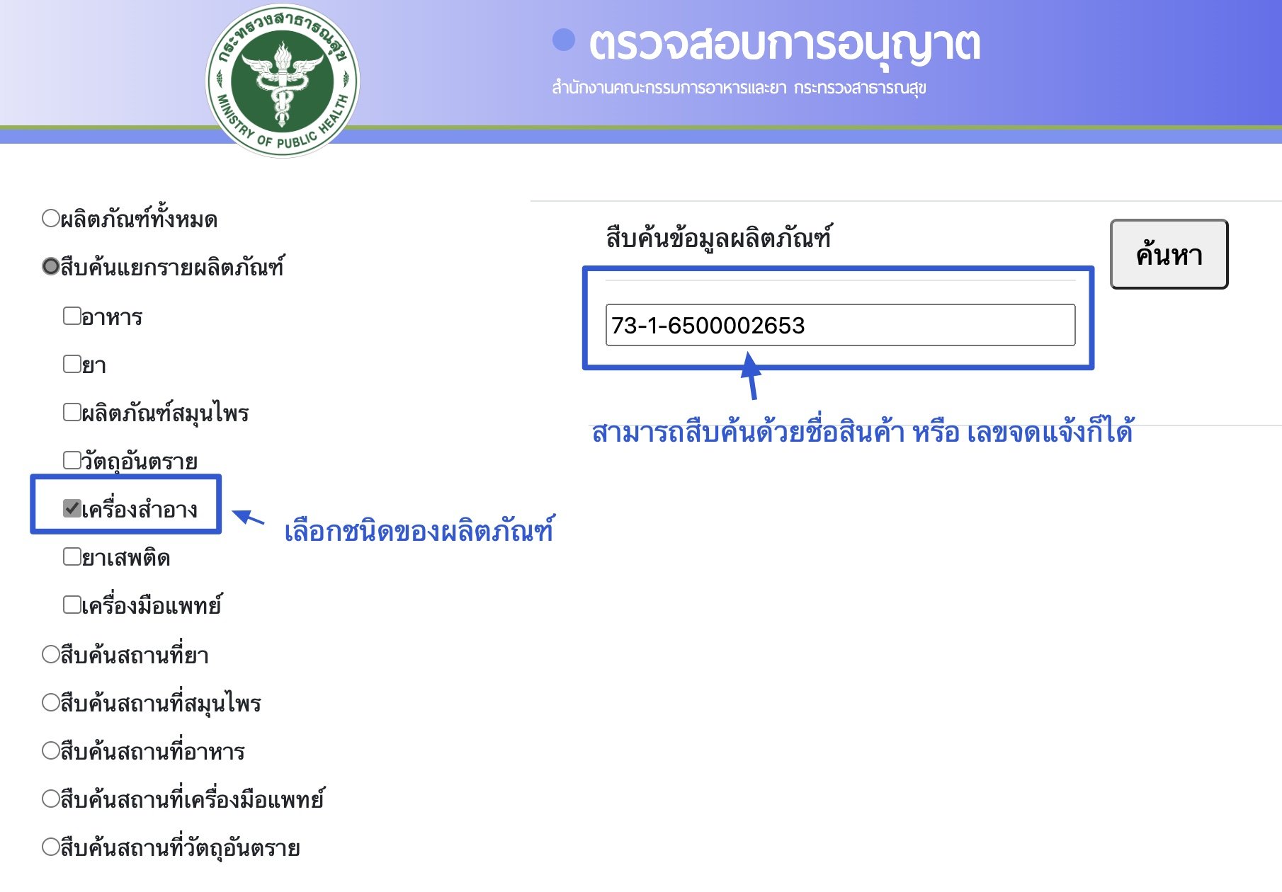 1.ไปที่ เช็คเลขที่จดแจ้งเครื่องสำอาง