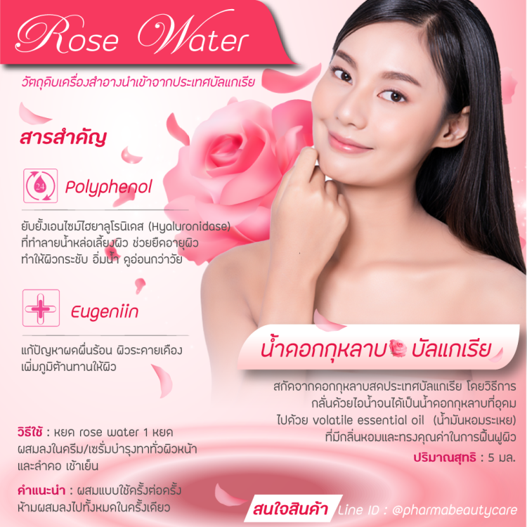 น้ำกุหลาบสกัดบริสุทธิ์ จากประเทศบัลแกเรีย อุดมไปด้วยสาร โพลีฟีนอลและยูจีนิน ช่วยเพิ่ม ภูมิต้านทานให้ผิว ลดการระคายเคือง ทำให้ผิวแข็งแรง และช่วยยับยั้งเอนไซม์ไฮยาลูโรนิเดสที่ ทำลายน้ำหล่อเลี้ยงผิว จึงช่วยยืดอายุผิว ทำให้ผิว กระชับ อิ่มน้ำ ดูอ่อนกว่าวัย