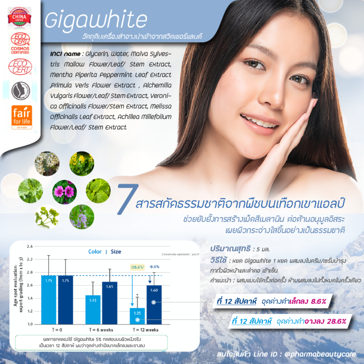 7 สารสกัดธรรมชาติจากเทือกเขาแอลป์ ช่วยยับยั้งการสร้างเม็ดสีเมลานิน ต่อต้านอนุมูลอิสระ ลดเลือนฝ้ากระ จุดด่างดำ เผยผิวกระจ่างใสขึ้นอย่างเป็นธรรมชาติ