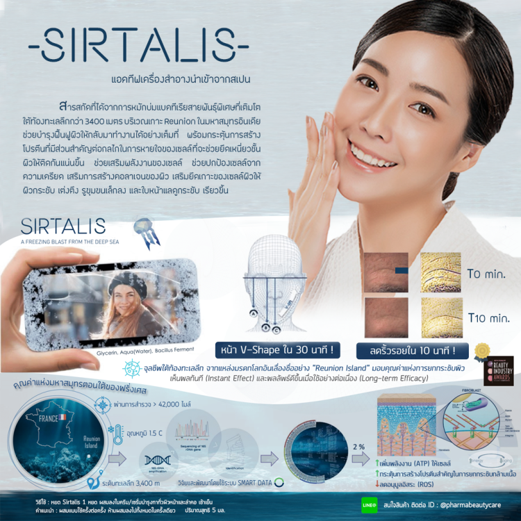 สารสกัดจากจุลชีพใต้ท้องทะเล ที่มีแสงออโรร่า พาดผ่าน ช่วยเพิ่มคอลลาเจน อิลาสติน และจุดเกาะของไฮยาลูโรนิค แอซิด ใต้ผิว ช่วยลดการถูกทำลายโครงสร้างใต้ชั้นผิว จากแสงสีฟ้า เพิ่มเกาะป้องกันผิวให้แข็งแรงขึ้น