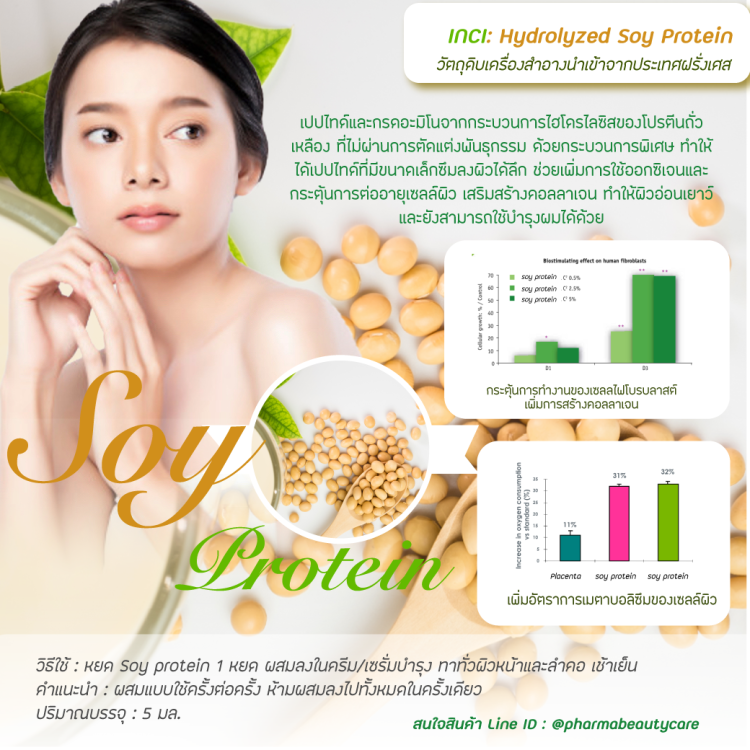 เปปไทด์และกรดอะมิโนจากกระบวนการไฮโดรไลซิสของโปรตีนถั่วเหลือง ที่ไม่ผ่านการตัดแต่งพันธุกรรม ด้วยกระบวน การพิเศษ ทำให้ได้เปปไทด์ที่มีขนาดเล็กซึมลงผิวได้ลึก ช่วยเพิ่มการใช้ออกซิเจนและกระตุ้นการต่ออายุเซลล์ผิว เสริมสร้างคอลลาเจน ทำให้ผิวอ่อนเยาว์ และยังสามารถใช้บำรุงผมได้ด้วย