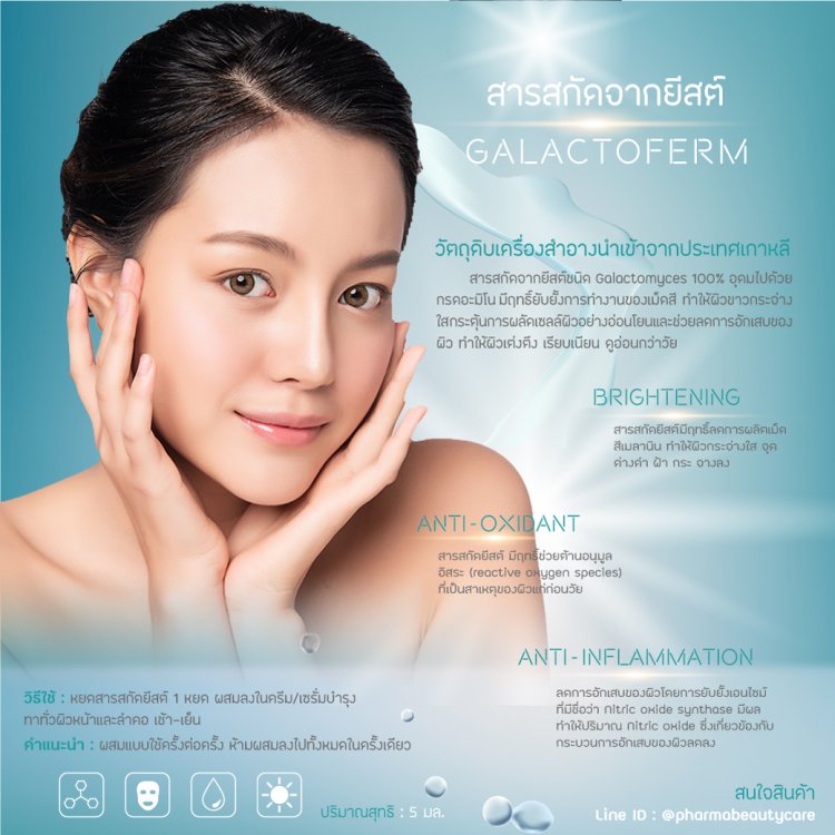 สารสกัดจากยีสต์ชนิด Galactomyces 100% อุดมไปด้วยกรดอะมิโน มีฤทธิ์ยับยั้งการทำงานของเม็ดสี ทำให้ผิวขาวกระจ่างใส กระตุ้นการผลัดเซลล์ผิวอย่างอ่อนโยนและช่วยลดการอักเสบของผิว ทำให้ผิวเต่งตึง เรียบเนียน ดูอ่อนกว่าวัย